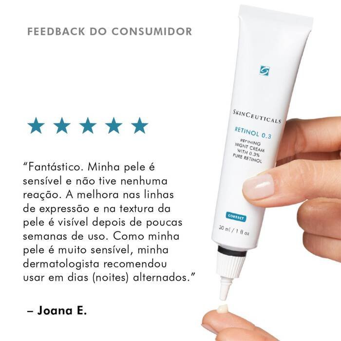 Retinol 0.3 é um creme facial concentrado com retinol puro que melhora a aparência de sinais visíveis de envelhecimento e poros, ao mesmo tempo que minimiza a aparência de imperfeições.