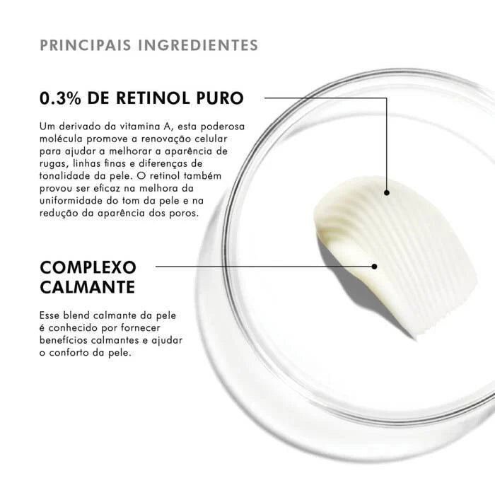 Este potente tratamento noturno apresenta 0,3% de retinol puro aprimorado com as mais recentes tecnologias de estabilização e entrega para garantir uma liberação constante e uniforme. Formulado com bisabolol calmante para minimizar a irritação e especialmente embalado para preservar sua potência, este creme facial com retinol ajuda a melhorar a aparência de linhas finas, rugas, descoloração, imperfeições e poros, acelerando a renovação celular. O creme de retinol 0.3 é ideal para uso contínuo.